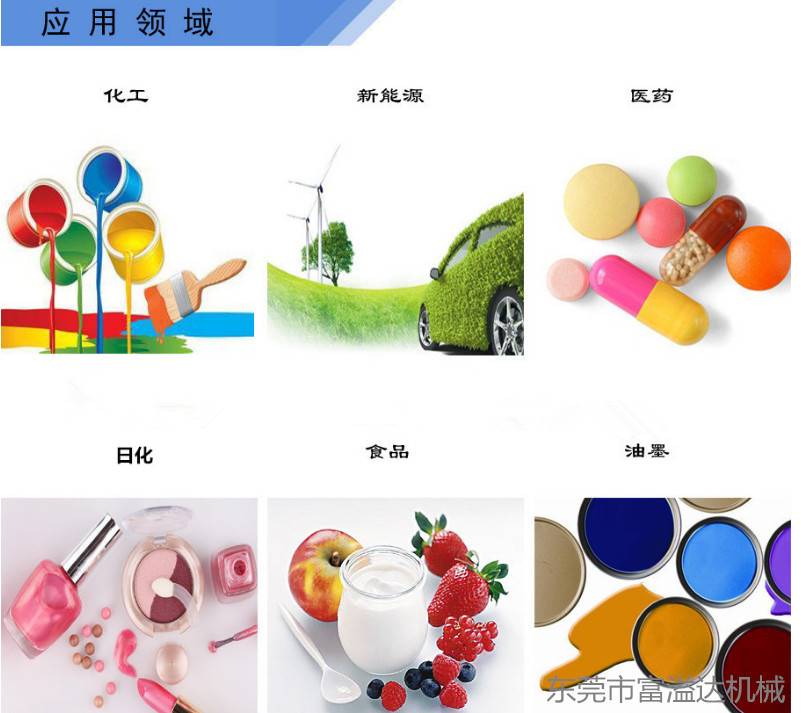 适用于涂料,染料,颜料,喷漆,油墨,胶合剂,树脂,软膏,化妆品,纸,食品,橡胶,复合材料,绝缘材料,磁性材料,其他色浆和其他化工产品-固湿法分散,研磨,搅拌,均质,混合和溶解加工装置。它也用以多气泡材料和易挥发溶剂的过程中。通过抽真空将材料分散在真空容器中以缩减气泡随着溶剂的挥发,处于真空状况的分散体可以加快材料的分散细度,并使材料迅速消泡。
