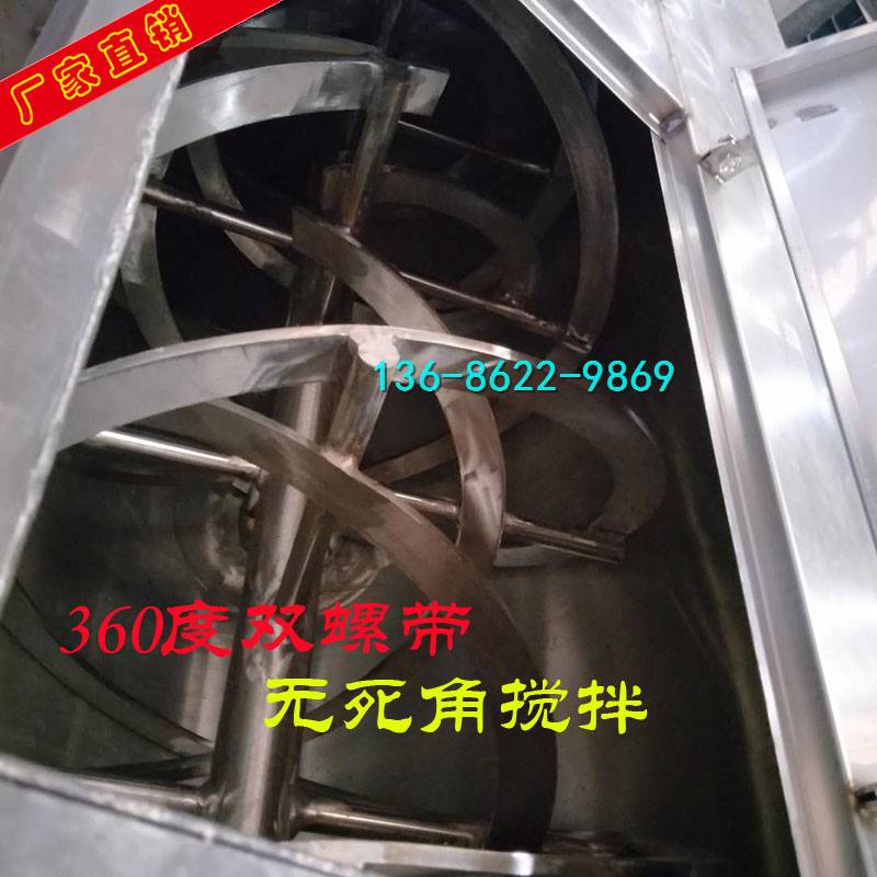 根据卧式螺旋带式混合机的工作原理,用以混合和混合的双螺旋带向相反方向促进物料的能力应基本相同,因为内部螺旋带的节距应低于外部螺旋带的节距为了达到相同的推料能力,内螺旋带的节距应低于外螺旋带的节距,宽度应大于外螺旋带的宽度,否则物料将集中在一个方向上。因此,选择卧式搅拌机时要留意这一点。