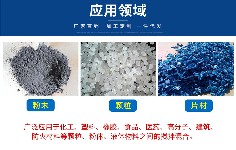 干燥化学品,洗涤剂,涂料,树脂,玻璃硅,颜料,农药,肥料,饲料,饲料添加剂,小麦粉,奶粉,香料,微量成份,咖啡,盐,添加剂,塑料以及各种浆料和粉末的混合。